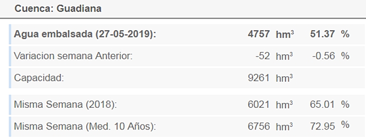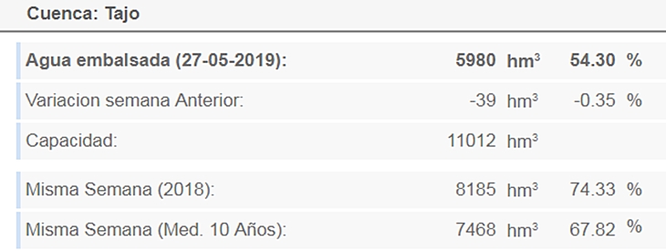 La reserva está en 33.852 hectómetros cúbicos a 28 de mayo de 2019, es decir, al 60'3% de su capacidad total, disminuyendo en la última semana en 92 hm³ (el 0,2% de la capacidad total de los embalses).