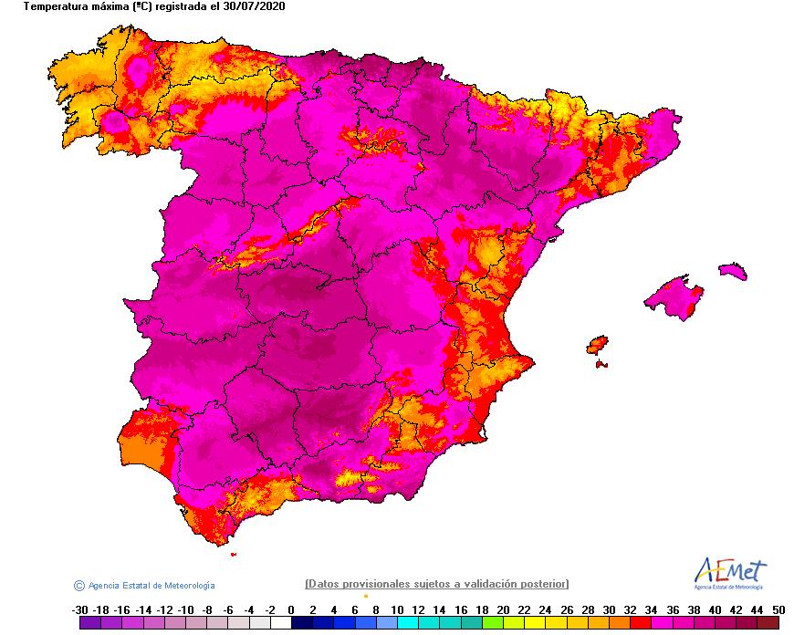 Anteriormente, Burgos había superado el día 27 su récord del mes de julio con 38 ºC; y las ciudades de Palma (Mallorca) y Lleida igualaron sus registros más elevados de temperatura máxima y mínima, con 40,6 ºC y 23,3 ºC el día 28 en ambos casos. En algunos puntos del Cantábrico, los termómetros alcanzaron, el pasado día 30, valores entre 15 y 17 ºC por encima de lo normal, y las noches tropicales, aquellas cuya temperatura mínima es superior a los 20 ºC, han sido frecuentes en muchas zonas de España durante el mes de julio.