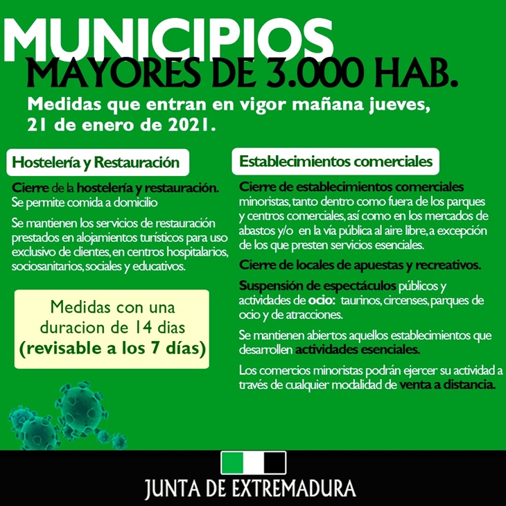 - Cierre de hostelería y comercio excepto actividad esencial en municipios de más de 3.000 y 5.000 habitantes.