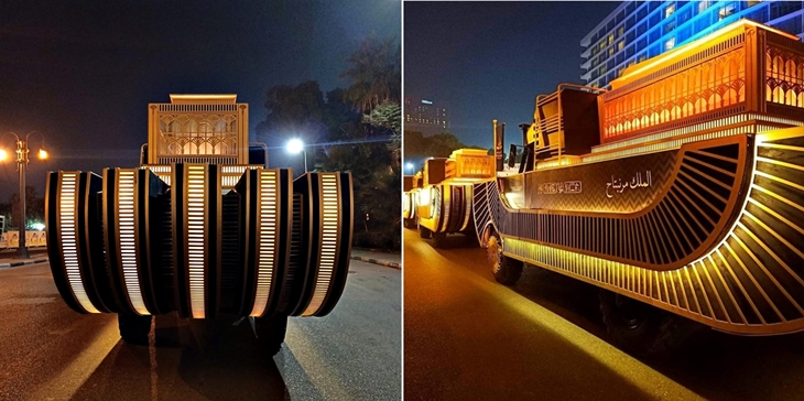 Cada faraón será paseado en su sarcófago transportado por una carroza dorada de estilo antiguo, hechas por artistas egipcios imitando a los carros de combate encontrados en la tumba de Tutankhamón pero con tecnología moderna, en un envoltorio que contiene nitrógeno, en condiciones muy similares a las de las urnas en las que estaban en el museo. Los vehículos que las transportan tienen además un mecanismo para evitar los impactos.