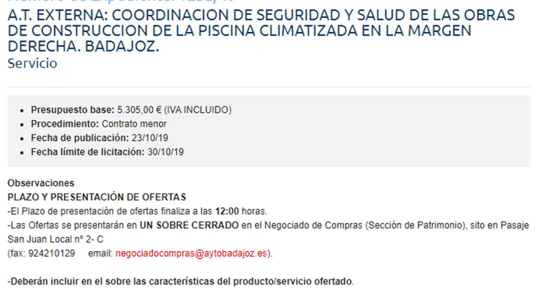 A fecha del 14 de febrero de 2019 se firmaba el Contrato por la Ute. Martín Casillas, S.L y Sehuca S.L y el Consistorio pacense para llevar a cabo el proyecto y construcción de la piscina cubierta en la margen derecha del Guadiana, así, este miércoles, 30 de octubre, se cerraba el plazo para enviar las solicitudes para licitar la contratación externa para la Coordinación de Seguridad y Salud de las Obras y se podía observar ya un solar sin eucaliptos y desbrozado con la maquinaria en marcha destinada a llevar a cabo las excavaciones.