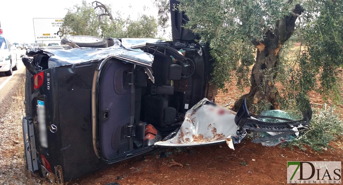 Como consecuencia del violento choque, el vehículo salía desplazado de la calzada e iba a parar a la cuneta. Allí quedaba atrapado el conductor del mismo, quien tenía que ser excarcelado por los Bomberos del CPEI de Villafranca de los Barros,