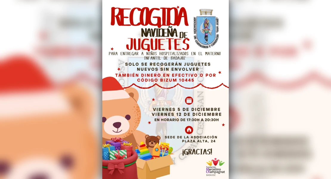 La Asociación de Costaleros y Capataces "San José" ha puesto en marcha su primera Recogida Navideña de Juguetes, una iniciativa solidaria destinada a llevar alegría a los niños hospitalizados en el Materno Infantil de Badajoz durante las próximas fiestas. La campaña, promovida por la nueva Junta Directiva dentro de su obra social, marca un paso adelante en el compromiso de la entidad por reforzar su presencia y acción social en la ciudad.