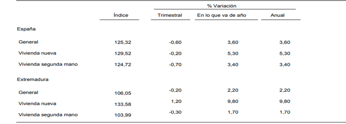 El Instituto de Estadística de Extremadura (IEEX) ha publicado la información elaborada sobre el índice de precios de vivienda en la región. Dicho informe se ha elaborado a través de los datos aportados por el Instituto Nacional de Estadística (INE).