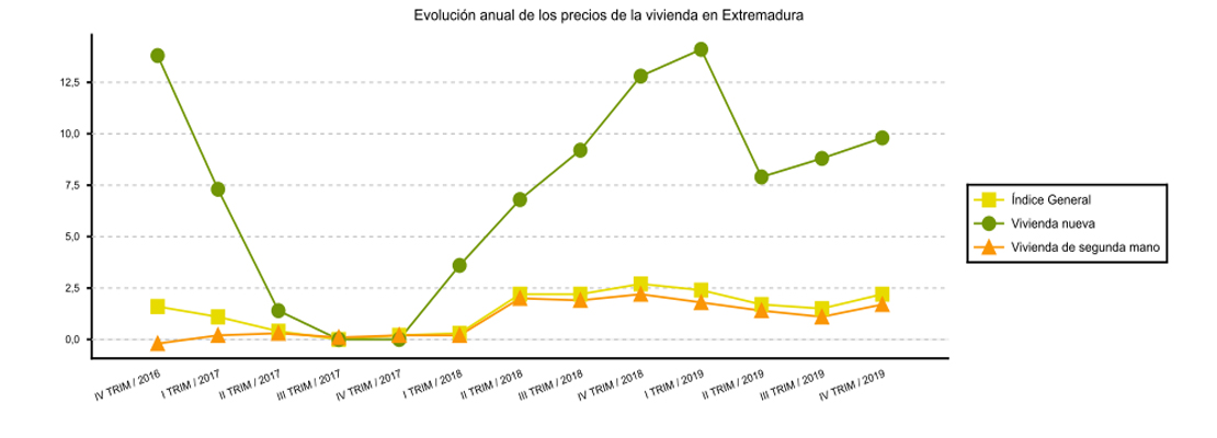 Así, el Índice de Precios de Vivienda (IPV) en el cuarto trimestre de 2019 en Extremadura aumentó en un 2,2% en tasa anual y un 0,2% menos respecto al trimestre anterior.