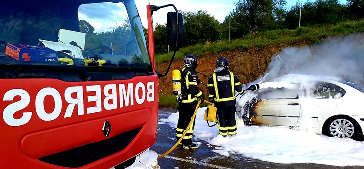 Bomberos del CPEI eran requeridos al filo de las siete de la tarde para actuar en la rotonda de entrada a la localidad, pues un turismo BMW se encontraba ardiendo.