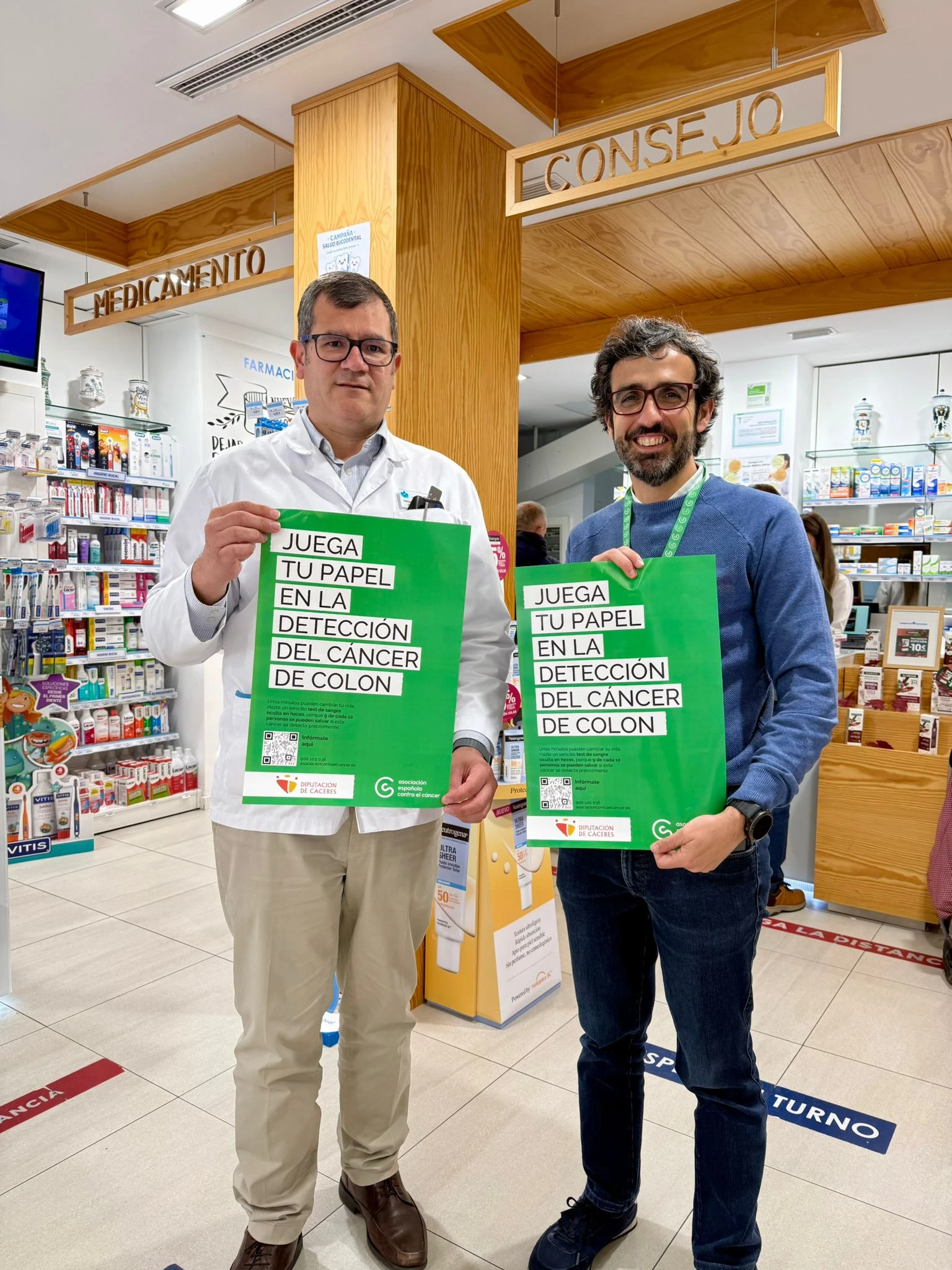 El presidente del Colegio de Farmacéuticos de Cáceres, Juan José Hernández, y el gerente de la Asociación Española Contra el Cáncer en Cáceres, Nacho Lucero, con los carteles de la campaña ‘Juega tu papel’, visibles en las farmacias.