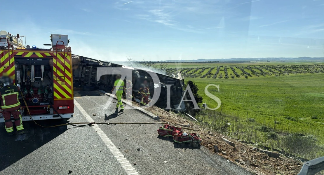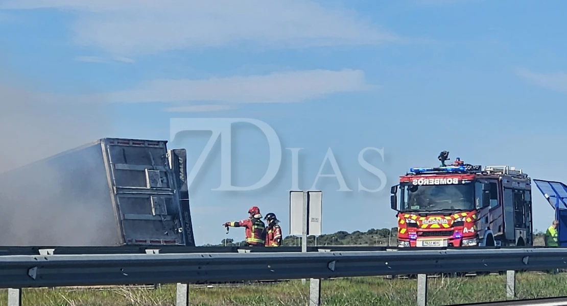 Un camión que circulaba en dirección Portugal ha sufrido un accidente en la autovía A-5 a su paso por Badajoz, a la altura del kilómetro 404, justo frente a la salida hacia el Polígono El Nevero.