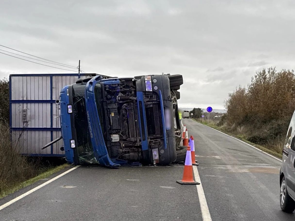 El mismo ha consistido en la salida de la vía de un camión cargado de ganado y su posterior vuelco en calzada. A pesar del aparatoso incidente, no hay que lamentar daños personales, únicamente materiales.