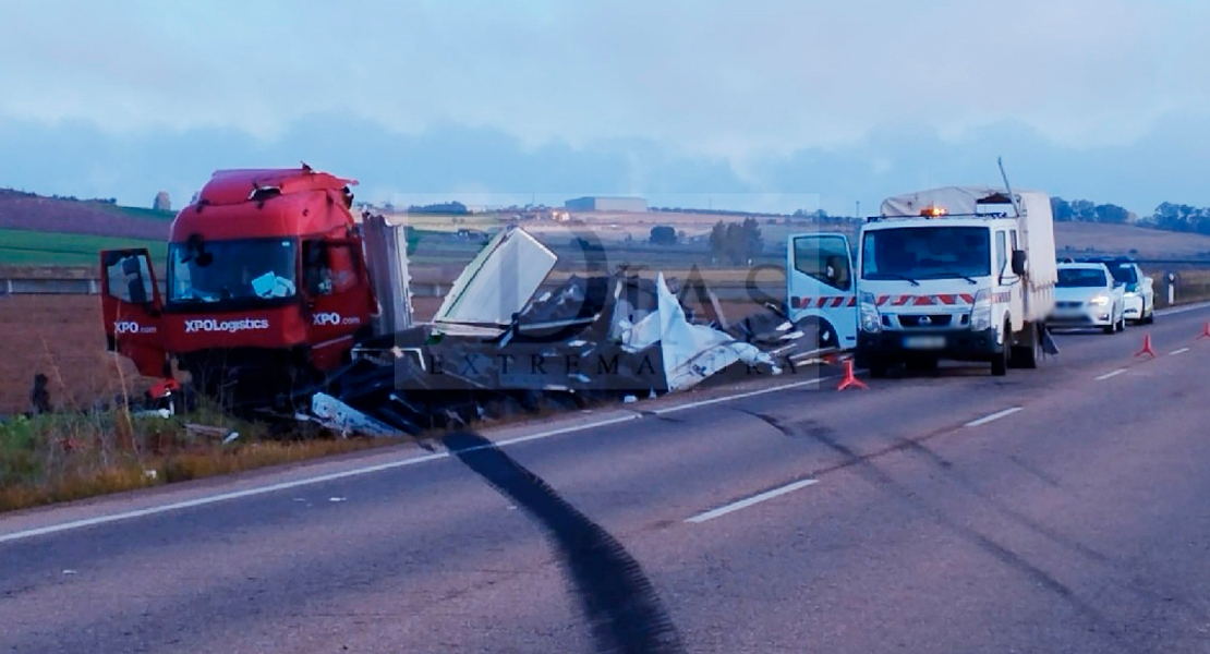 Esta mañana el conductor de un tráiler perdía el control por causas que se desconocen y están siendo estudiadas por los agentes de la agrupación de Tráfico de la Guardia Civil y se salía por la parte izquierda de la calzada en la EX-363.