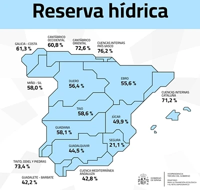 La reserva hídrica española está al 54 % de su capacidad total. Los embalses almacenan actualmente 30.274 hectómetros cúbicos (hm³) de agua, aumentando en la última semana en 126 hm³ (el 0,2 % de la capacidad total actual de los embalses).