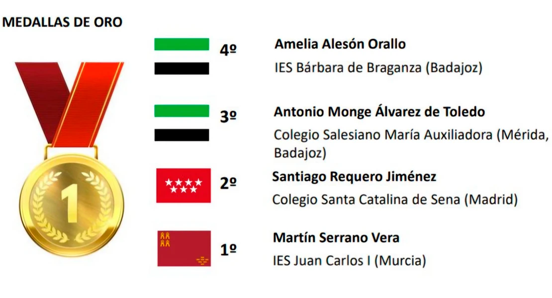 Estos estudiantes son Antonio Monge Álvarez de Toledo, alumno del Colegio Salesiano María Auxiliadora de Mérida, quien obtuvo el mejor resultado con una medalla de oro y el tercer puesto nacional. Por su parte, la estudiante del IES Bárbara de Braganza de Badajoz, Amelia Alesón Orallo, volvía a casa con otra medalla de oro y el cuarto puesto nacional.