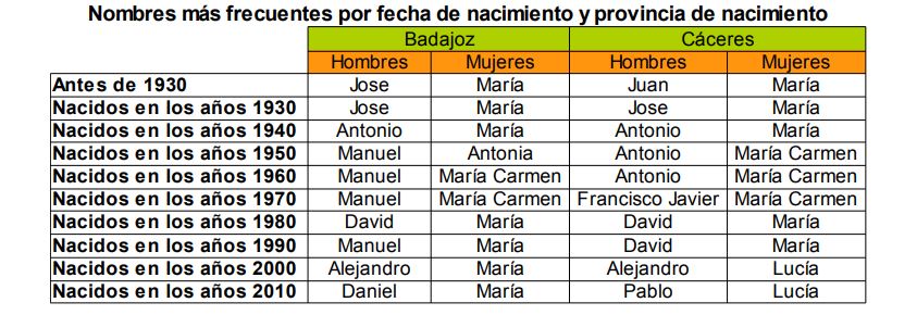 El Instituto de Estadística de Extremadura, organismo perteneciente a la Junta de Extremadura, publica la información elaborada sobre los apellidos y nombres más frecuentes a partir de los datos proporcionados por el Instituto Nacional de Estadística.