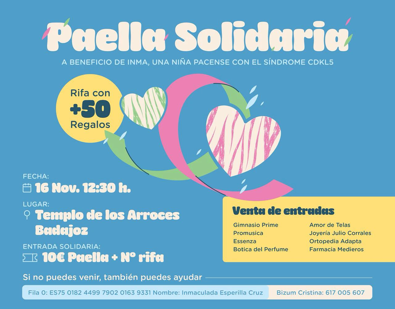 Con la finalidad de dar visibilidad a esta enfermedad y recoger ayuda para este caso concreto, la familia de Inma ha organizado una paella solidaria en el Templo de los Arroces de Badajoz. El domingo de la semana que viene, en horario de 12:30 a 18:00 horas, ciudadanos pacenses podrán mostrar su apoyo asistiendo a esta jornada y comprando por el precio de 10 euros una entrada que, a su vez, contará con un número de participación en una rifa de más de 50 premios (masajes, manicura, noches de hotel, bisutería, y muchos más).