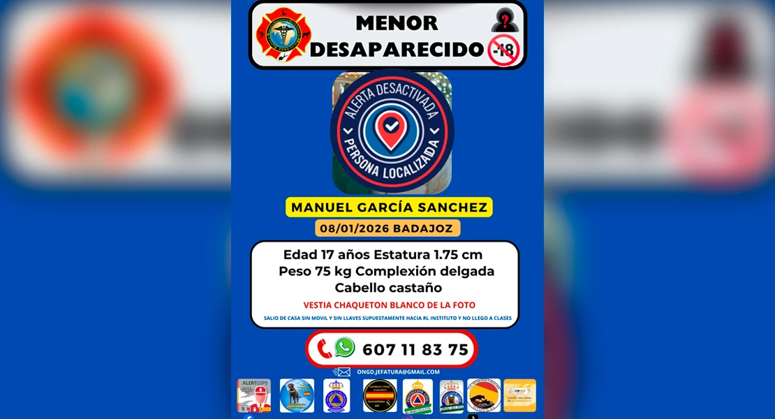 Pocas horas después, fuentes policiales confirman a este medio que el joven ha sido encontrado en perfecto estado de salud en la capital pacense, por lo que queda desactivada la alerta y se da por cerrado el dispositivo de búsqueda.