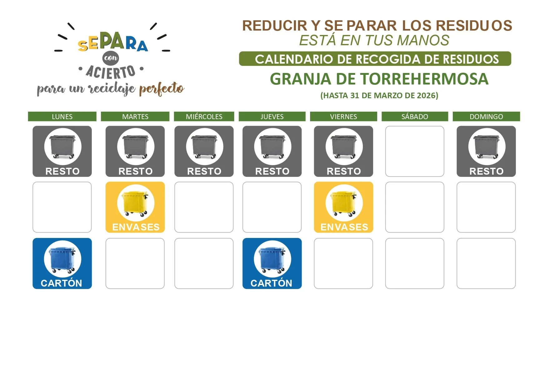 Según la programación del consorcio y para dar cumplimiento a la legislación en materia de residuos, Granja de Torrehermosa se incorporará a la recogida de la fracción orgánica a través del contenedor marrón cerrado con llave durante el mes de marzo de 2026. Esta nueva implantación llevará consigo acciones de planificación, reparto de materiales y difusión de información a la población en las semanas previas a la puesta en marcha.