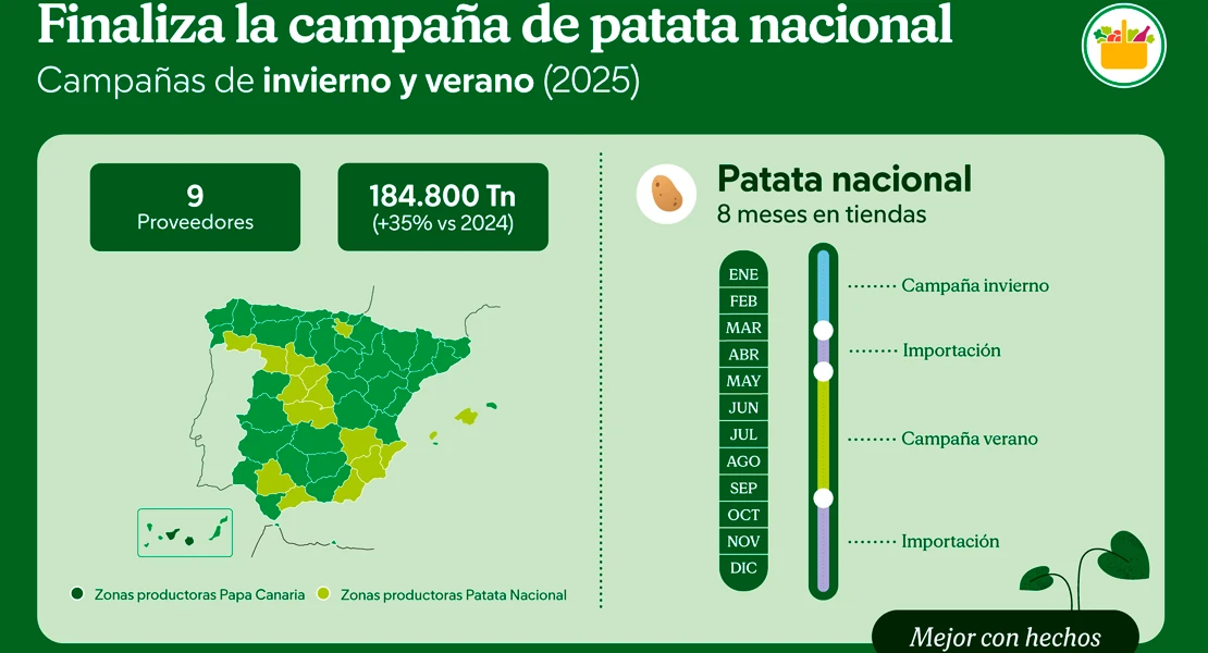 No obstante, sigue manteniendo algunas referencias de origen nacional, como es la patata especial freír de 2 kilos en tiendas de Península e Illes Balears o la patata de carne blanca en tiendas de Galicia y Asturias, ambas hasta principios de año.