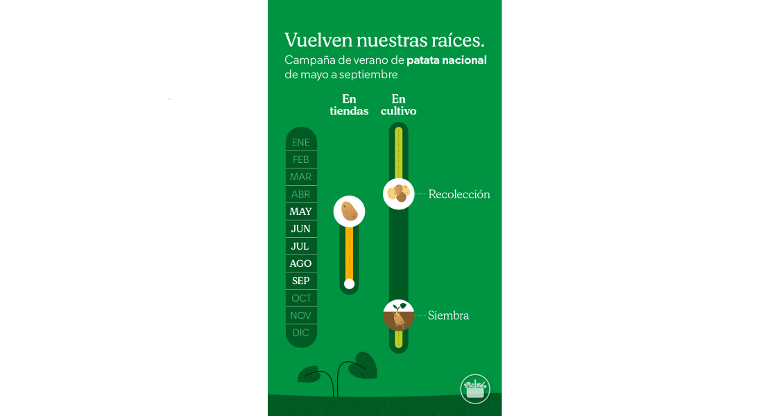 Mercadona ofrece ya patata nacional en todas sus tiendas en sus tres principales formatos: a granel, malla de 3 kilos y malla de 5 kilos. Conforme avance la campaña, irá incorporando la patata nacional en el resto del surtido: roja, especial para freír, para guarnición y para microondas.