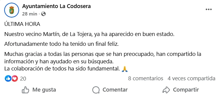 Tanto el consistorio de la localidad como Cruz Roja han confirmado que el hombre, Martín y vecino de La Tojera, ha aparecido en buen estado de salud.