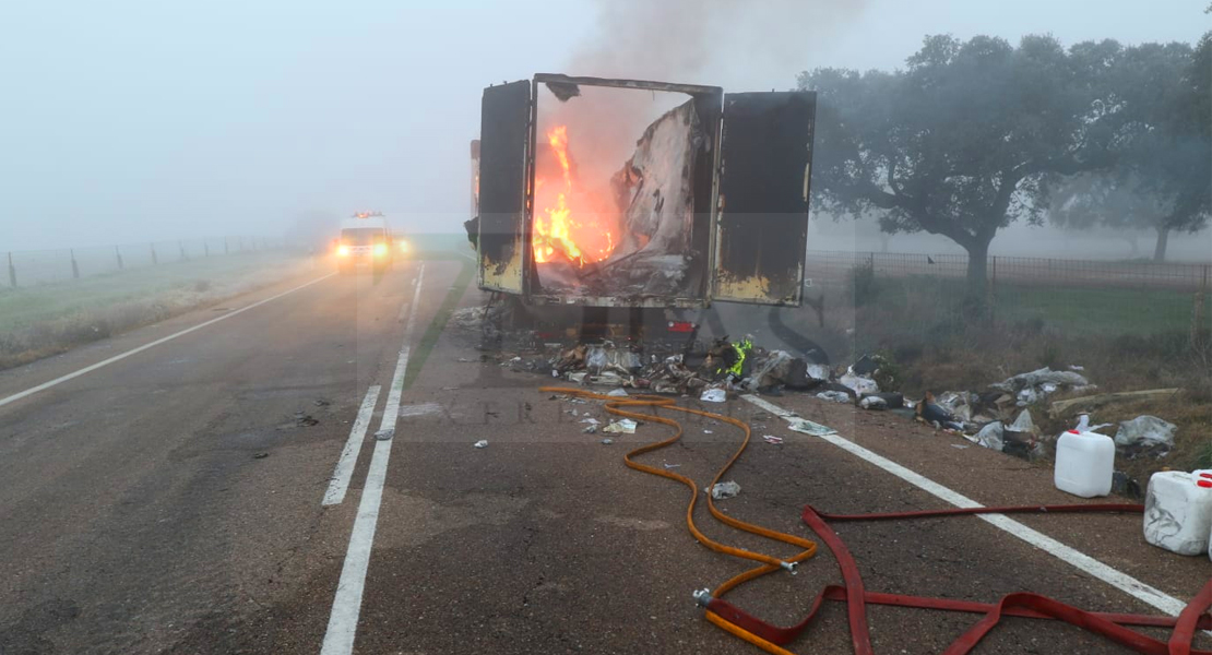 Sale ardiendo un tráiler en la N-523 cerca de Gévora (Badajoz) y provoca cortes