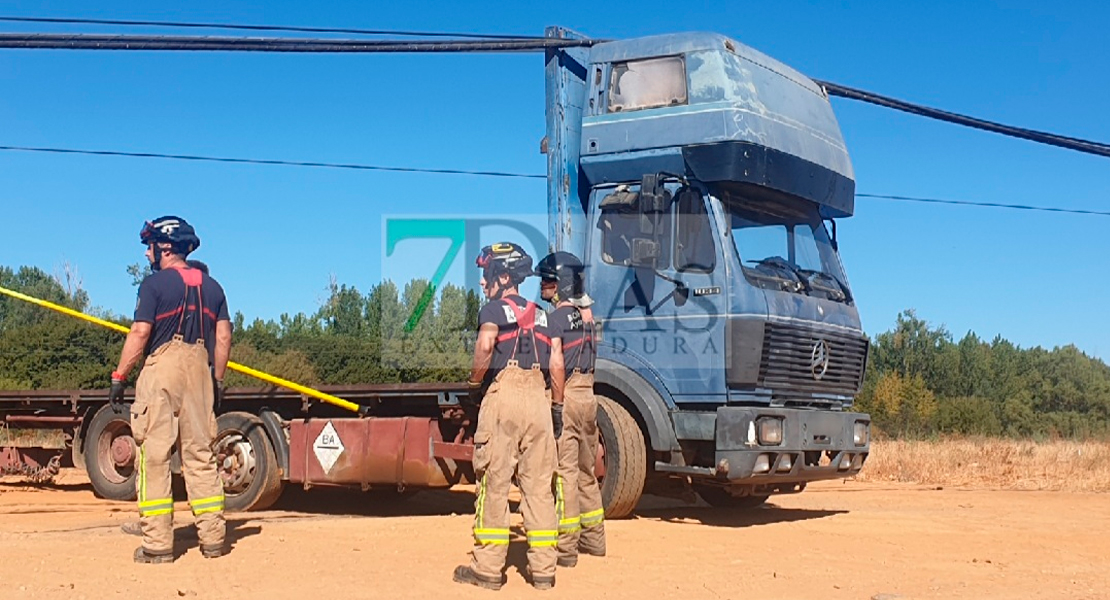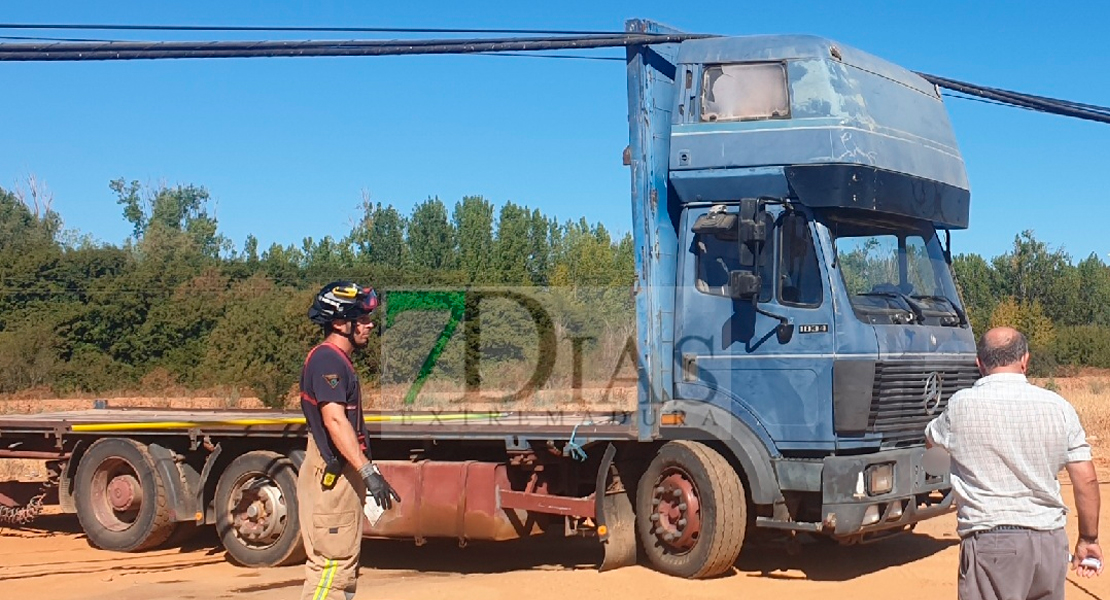 Un camión queda atrapado al ceder un poste y cableado en Valdebótoa (Badajoz)