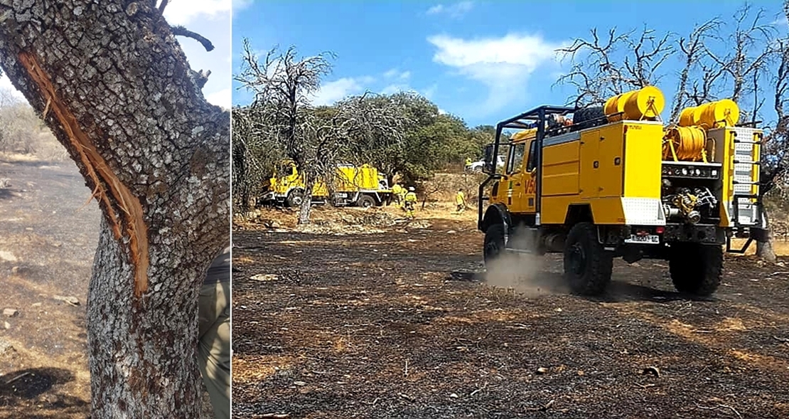 El Ayuntamiento de Berzocana informaba a través de su cuenta oficial en Facebook que: “estos son los caprichos de la naturaleza, mientras en el pueblo diluviaba por la tormenta a unos 3 kilómetros, en el Portijuelo: límite entre la dehesa y la finca El Molinillo, un rayo caía sobre una encina y provocaba un incendio.