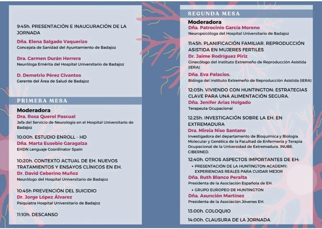 La primera mesa, moderada por la Dra. Rosa Querol Pascual, jefa del Servicio de Neurología del Hospital Universitario de Badajoz, tratará temas como el estudio Enroll-HD, los nuevos tratamientos y ensayos clínicos y la prevención del suicidio en pacientes con esta patología. En la segunda mesa, coordinada por la neuropsicóloga Patrocinio García Moreno, se abordarán cuestiones como la planificación familiar, la alimentación segura, la investigación en Extremadura y el papel de las asociaciones nacionales y europeas en la defensa de los afectados.