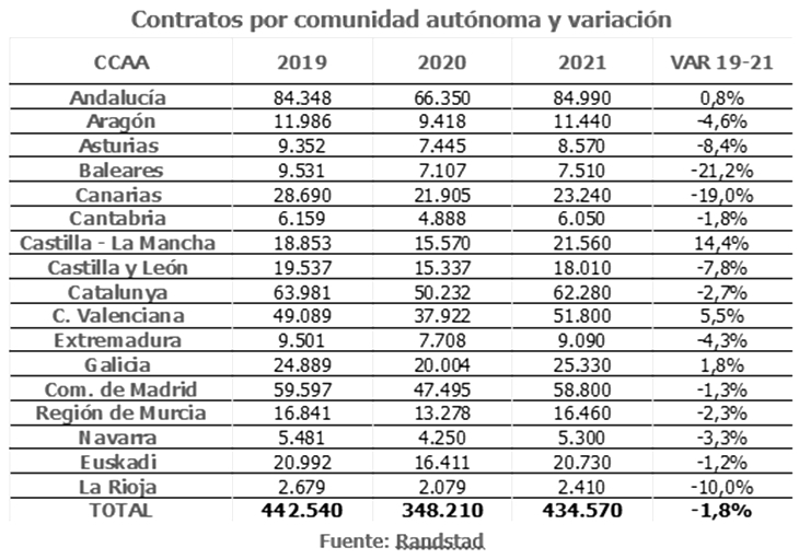En el conjunto del país, el estudio de Randstad estima que la campaña navideña registrará alrededor de 434.570 contrataciones, un volumen un 24,8% superior al año 2020, cuando se firmaron 348.210 (una diferencia de 86.360), aunque todavía un 1,8% inferior a 2019, antes del Covid, cuando se firmaron 442.540.