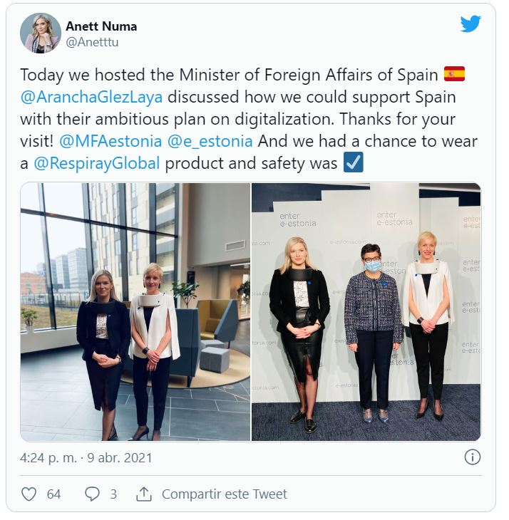 Durante su visita a Tallin (Estonia), la ministra aparece en una foto con dos empleadas del centro de investigación tecnológica e-Estonia Briefing Center, y mientras ésta lleva una mascarilla quirúrgica las profesionales sorprenden con una especie de collarín sobre los hombros.
