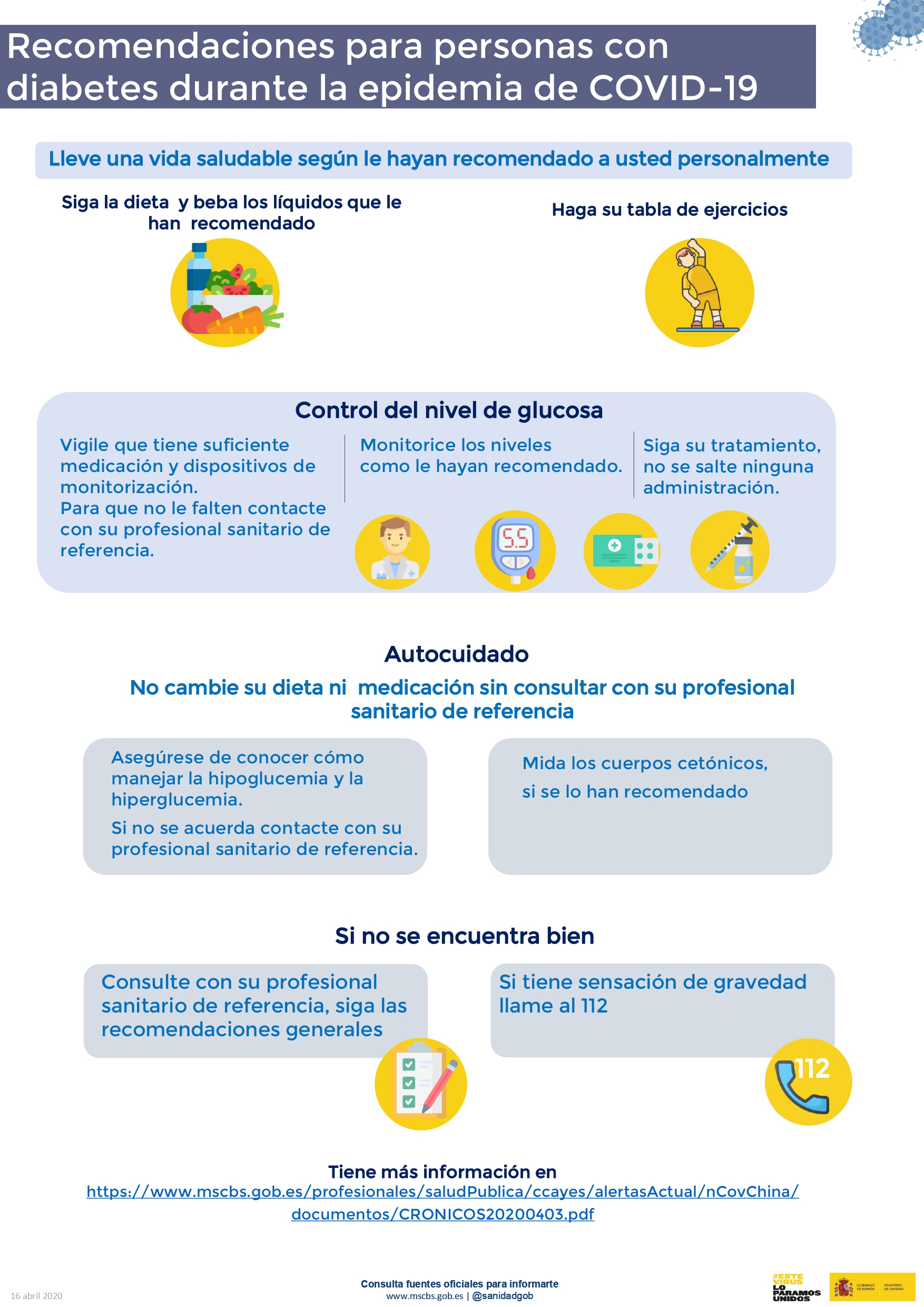 Además, también ha elaborado una serie de ellas para diabéticos durante la crisis del COVID-19. Los diabéticos deben asegurarse de tener la suficiente medicación y dispositivos de monitorización en casa, no cambiar la dieta o medicación sin consultarlo y, en caso de encontrarse mal, llamar inmediatamente al 112.