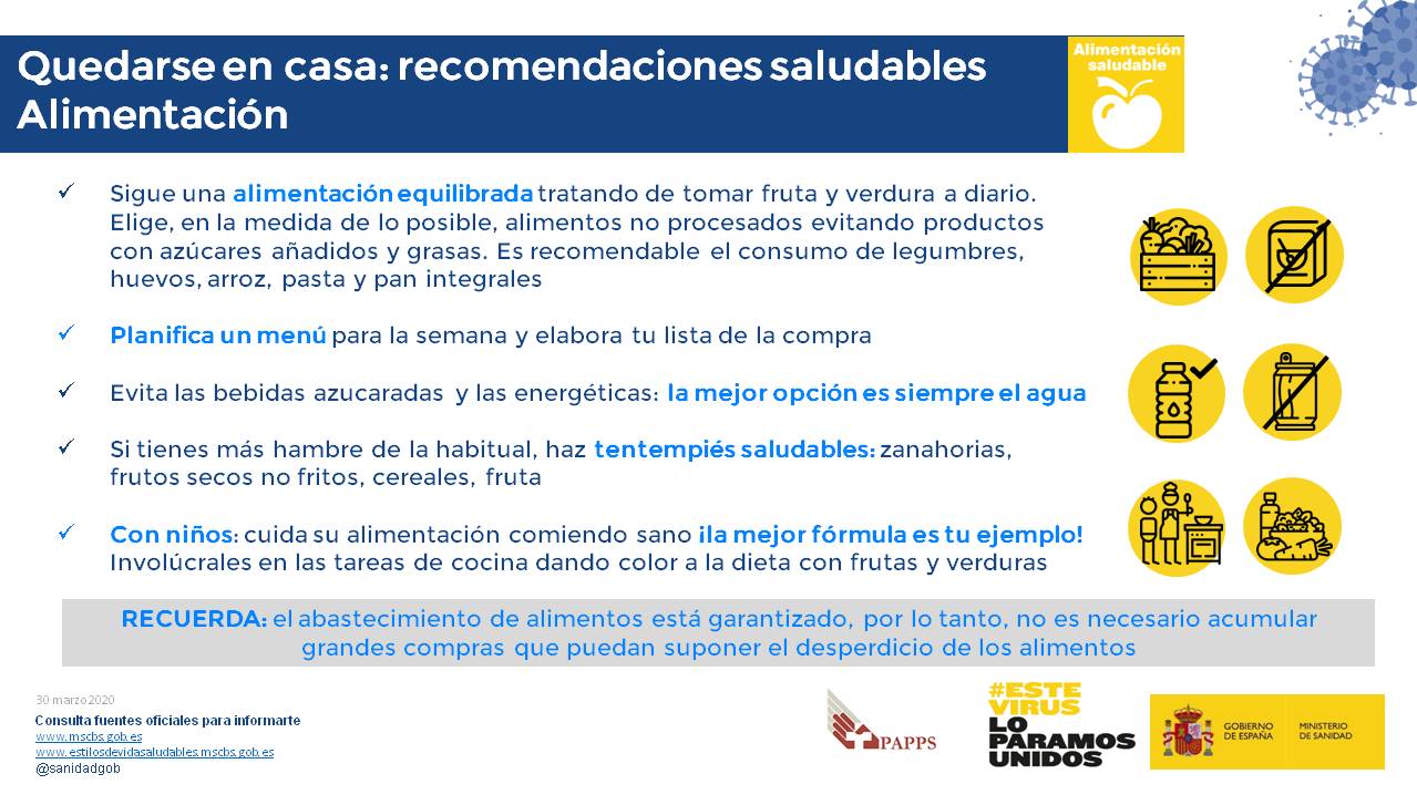 El Ministerio de Sanidad ha vuelto a hacer recomendaciones para el #QuédateEnCasa. Entre ellas destaca llevar una alimentación equilibrada, evitar alimentos procesados y las bebidas azucaradas y energéticas y no comprar en exceso, puesto que el abastecimiento está asegurado.